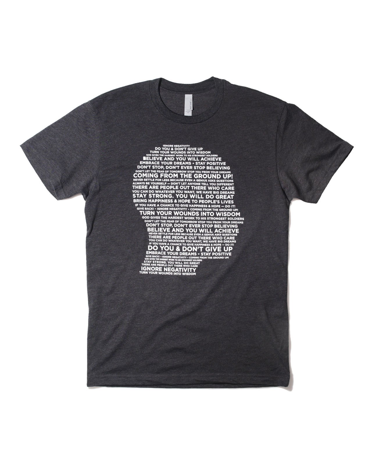 Next Level® apparel tri-blend charcoal grey is a looker. This charcoal number is no ordinary poly-cotton blend T-shirt, it cares so much about your comfort there’s even a tear off neck tag in case you get itchy. While you do life in comfort you will simultaneously be inspiring others with quotes from the members of Junket Designs (created by designer Tracey King). Words bringing hope for a better tomorrow.